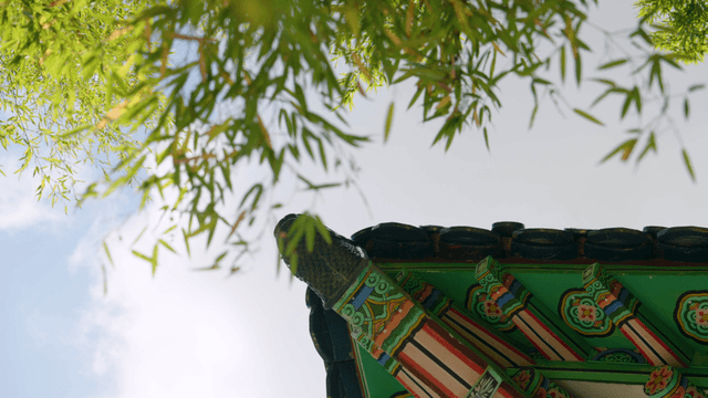 Traditional Korean roof eaves with floral patterns