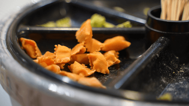 Person picks up a piece of squid from seafood pasta at a restaurant
