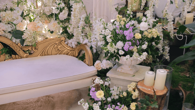 Bridal waiting room filled with white flowers and sofas