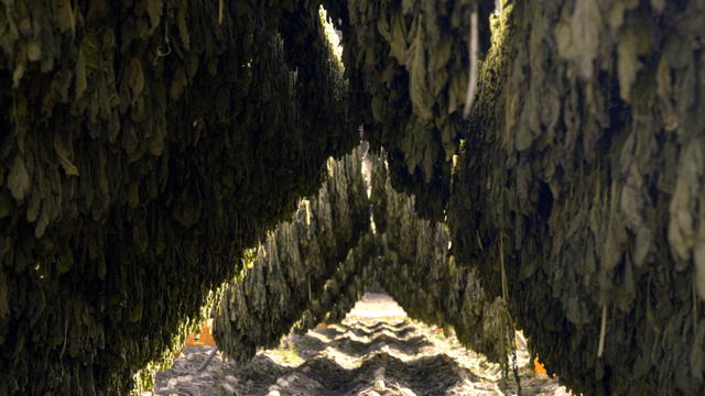 Dried sorghum and dried radish greens hanging on wall