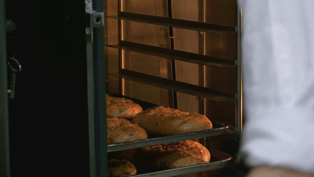 Freshly baked goods being wheeled out in a kitchen of bakery