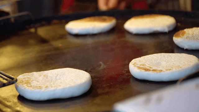 Korean Griddlecake with Sugar Filling being cooked on a griddle