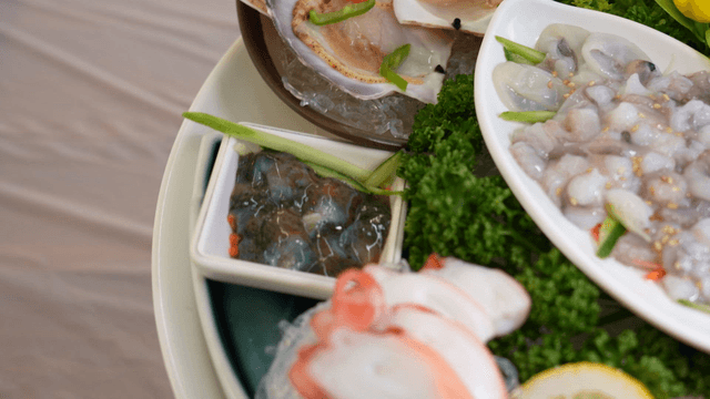 Table with variety of steamed seafood and raw fish
