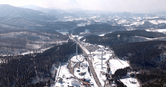 Snow-covered mountains with wind turbines