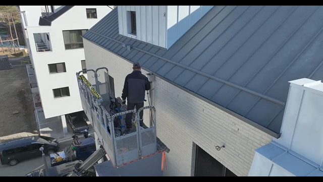 Workers maintaining buildings with crane lifts