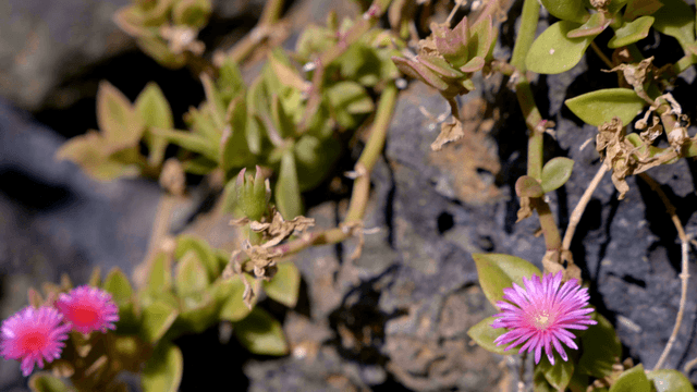 Pink flowers blooming on a rocky hillside