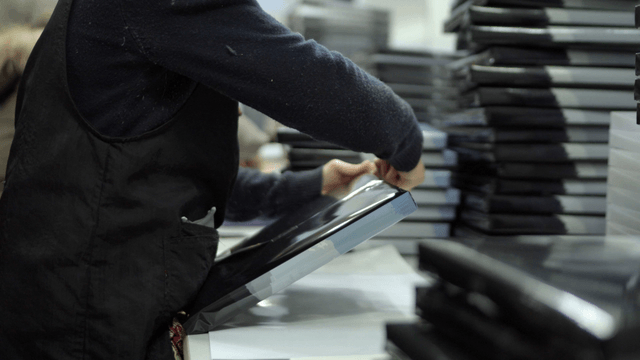 Worker handling metal sheets in a factory