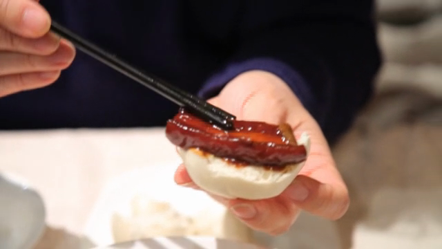 Eating hamburger steak sauce on bread