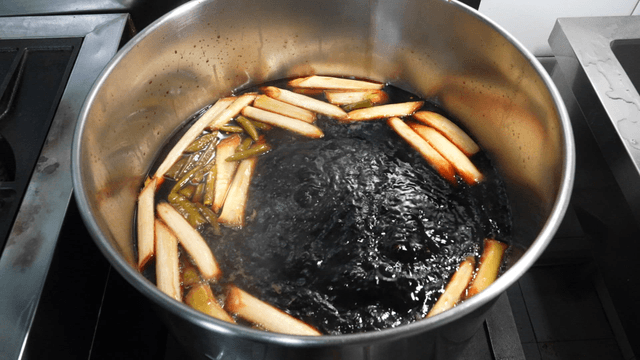 Soy sauce boiling in a pot with various ingredients