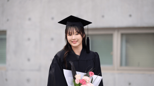 Graduate holding flowers with a smile