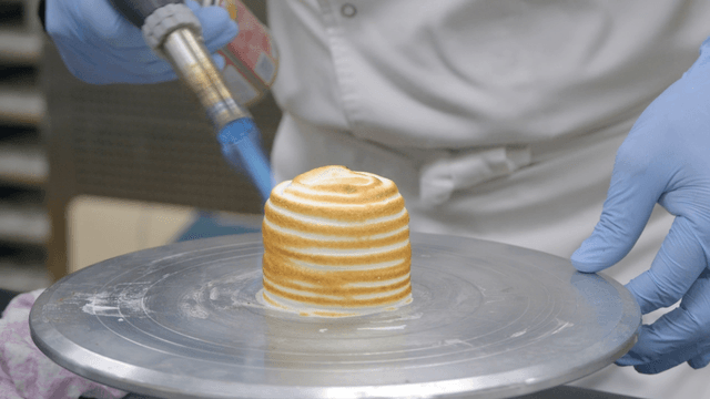 Chef using a blowtorch on a dessert