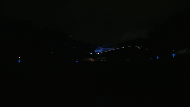 Person entering a tent with lights on at night