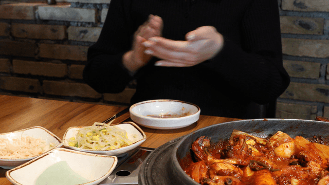 Person eating spicy Korean chicken jjagalbi with salad at restaurant