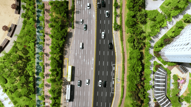 Busy downtown road surrounded by greenery