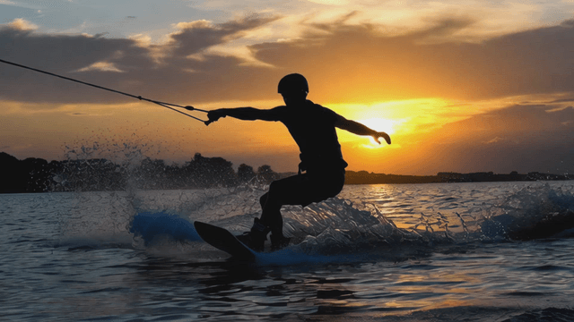 Wakeboarding at sunset on a calm lake