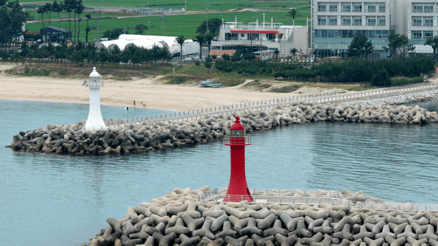Coastal view with lighthouses and breakwaters