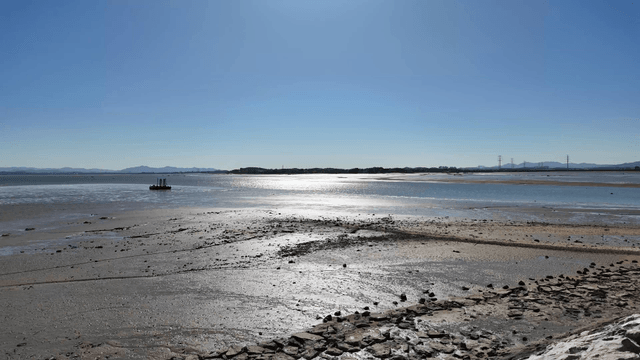 Tranquil tidal flat beach on clear day