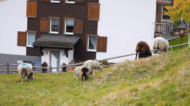 Sheep grazing near wooden houses