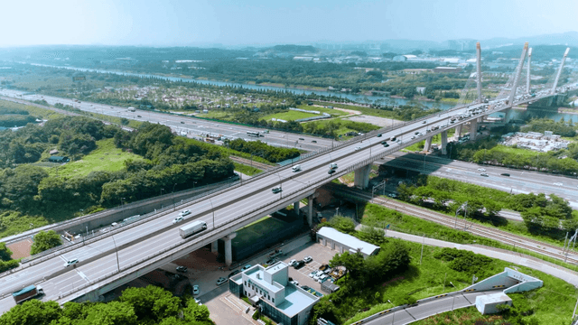 Bustling urban scene with numerous tall buildings and a network of intersecting highways over a ri