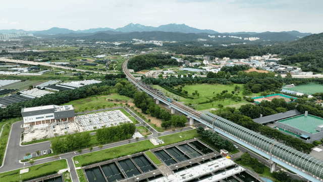 Passenger train traveling beside a serene lake while the sun sets in the background