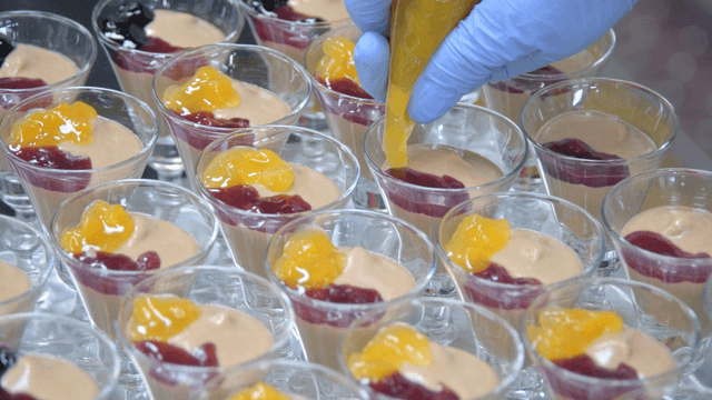 Refreshing fruit dessert and warm tea poured into a porcelain teacup