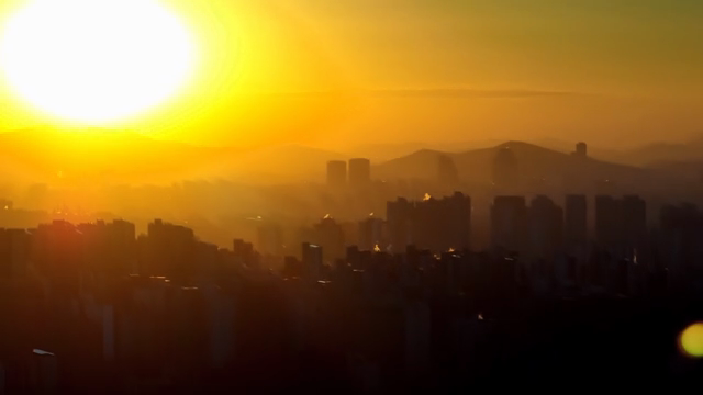 Sunset over a bustling city skyline