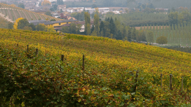 A scenic view of a vineyard and farmhouses