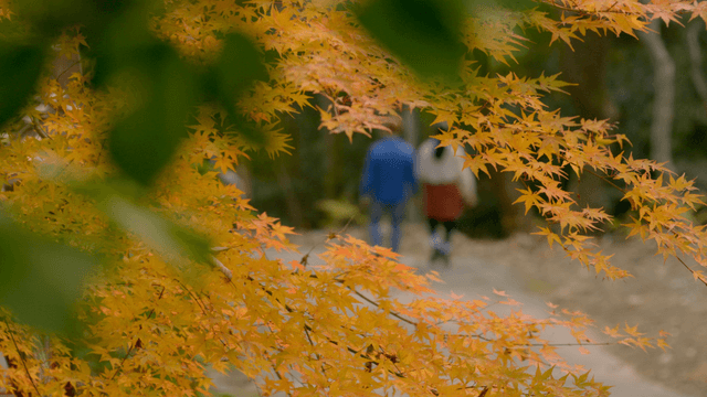 People walking up a stone path in autumn