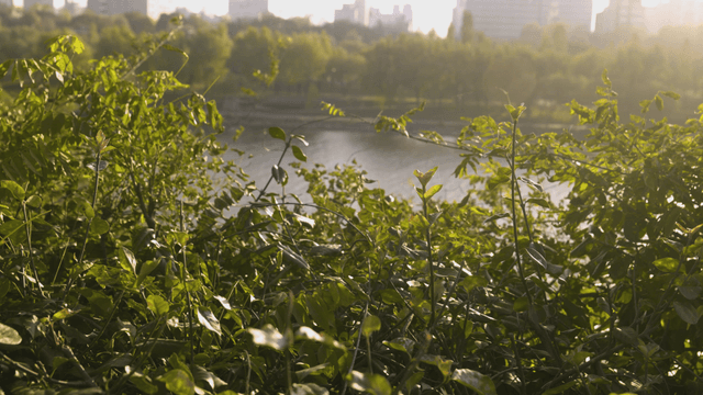 A serene riverside with lush greenery