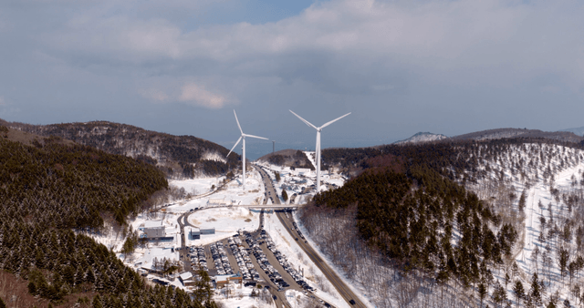 Snowy mountains with wind turbines
