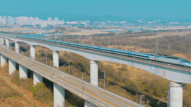 High-speed train on elevated tracks