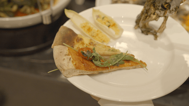 Person serving pizza and salad on plates at buffet
