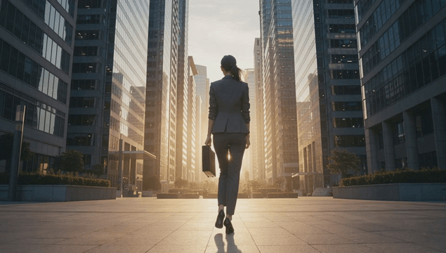 Back view of a female office worker walking through a modern cityscape