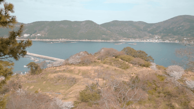 Cherry blossoms overlooking coastal town