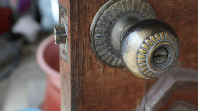 Close-up of a dark wooden door with a brass handle