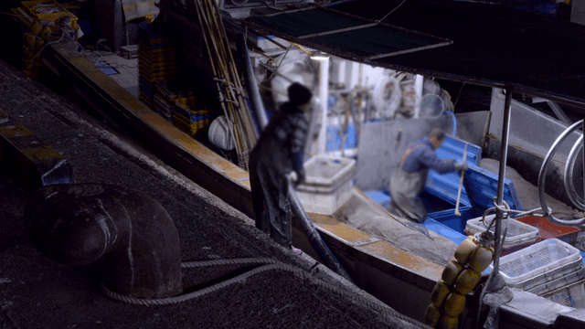 Fishing boats docked with crew working