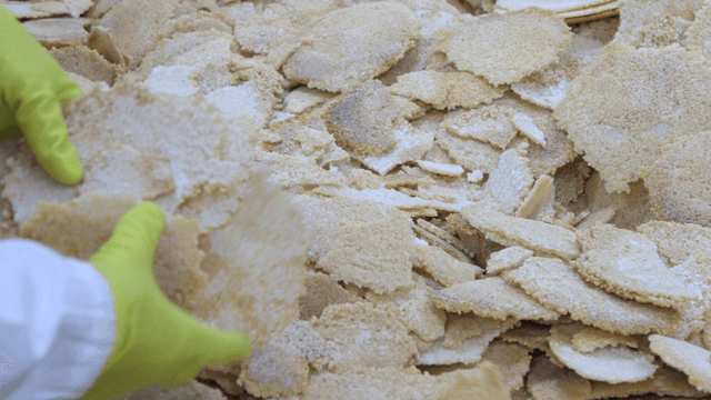 Hands in gloves handling rice crackers