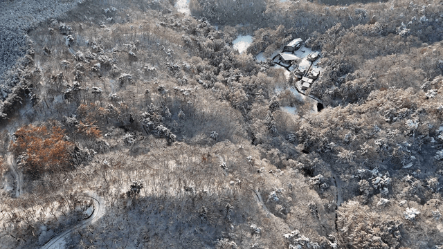 Snow-covered forest with a winding road