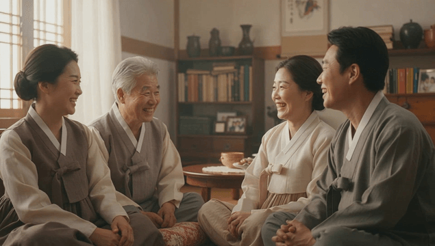 Family of men dressed in hanbok gathered in front of ancestral rite table