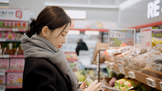 Young woman looking at food ingredient list at supermarket and putting it down.