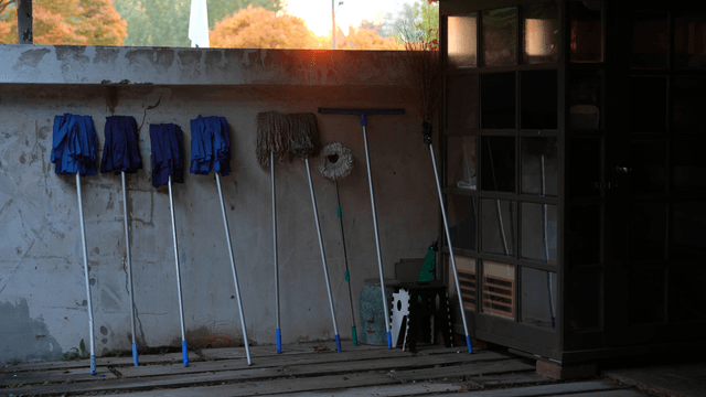 Cleaning supplies in a sunlit room
