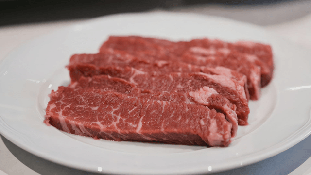 Marbled beef slices on a white plate