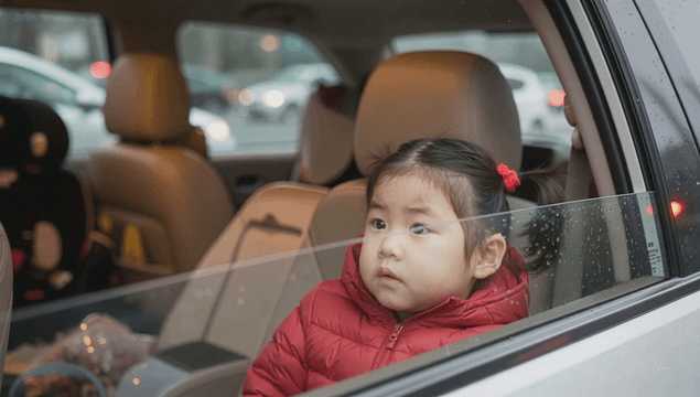 Young girl seated in a car, looking thoughtful.