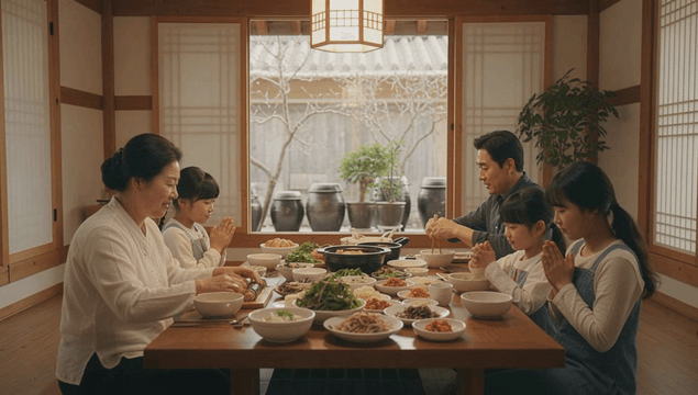 Family eating traditional Korean food