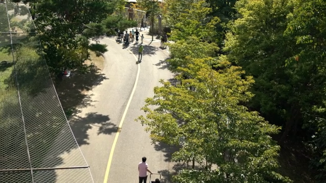 People walking in a park amidst tall green trees