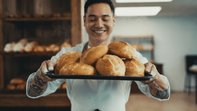 Freshly baked goods being wheeled out in a kitchen of bakery