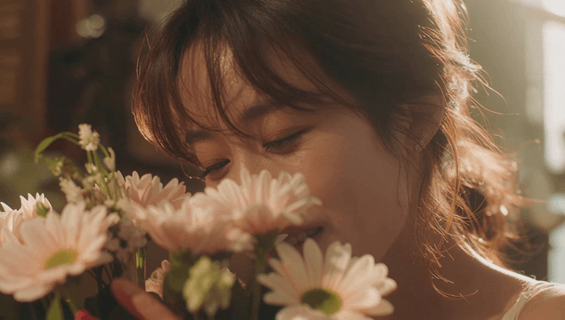 Woman smiling with flowers in sunlight