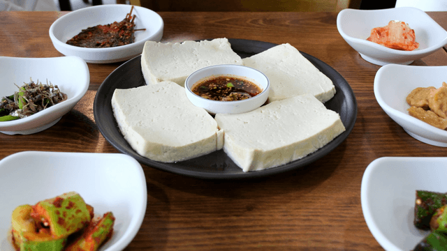 Tofu served with seasoning sauce and side dishes