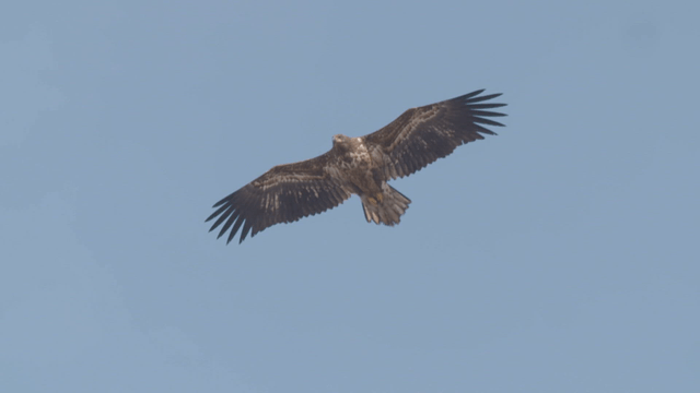 White-tailed eagle flapping wings beneath clear sky