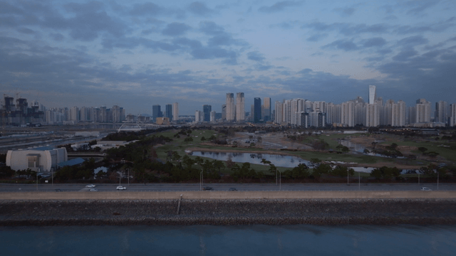 Modern cityscape with high-rise buildings overlooking the sea
